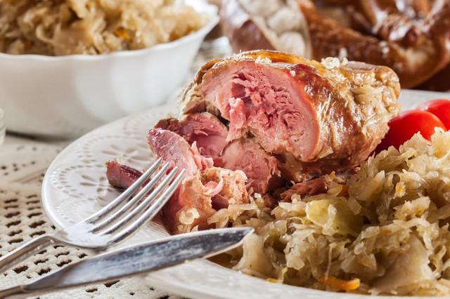 Порционные кусочки свиной рульки переложить на тарелки, рядом поместить еще теплую квашеную капусту и можно подавать на стол. Айсбан с тушеной квашеной капустой готов! В дополнение к основному блюду можно предложить свежие овощи.