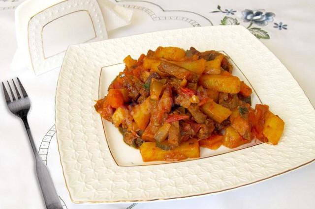 6. Помидоры моем, режем небольшими дольками, отправляем в сковородку вместе с томатной пастой, наливаем воду и тушим на слабом огне примерно 10 минут, после чего добавляем огурцы и тушим полчаса. Когда жидкость выкипит до половины, добавляем картошку, выдавливаем чеснок через пресс, добавляем мелко рубленый зеленый лук, держим на огне в течение 5 минут (в это время пробуем на соль, пока не поздно - корректируем вкус, если томатная паста и помидоры были с кислинкой, то можно добавить сахара, но я не добавляла).