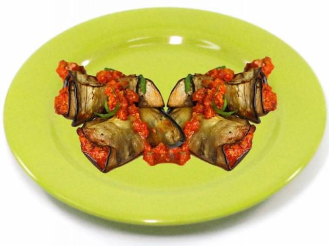 Баклажаны выложить на тарелку, полить пастой из помидор, посыпать натертым сыром и измельченным чесноком.