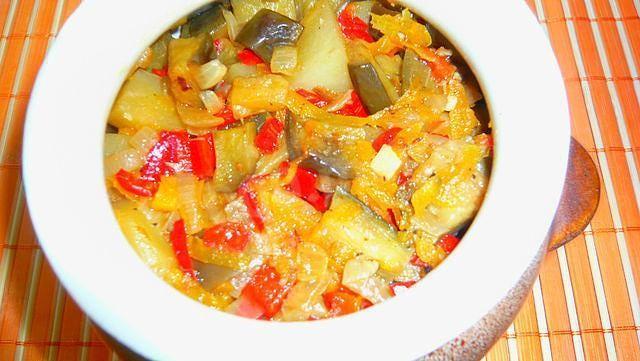 1 баклажан, 5-6 картофелин, 1 морковь, 2 луковицы, 1 болгарский перец, рас. масло