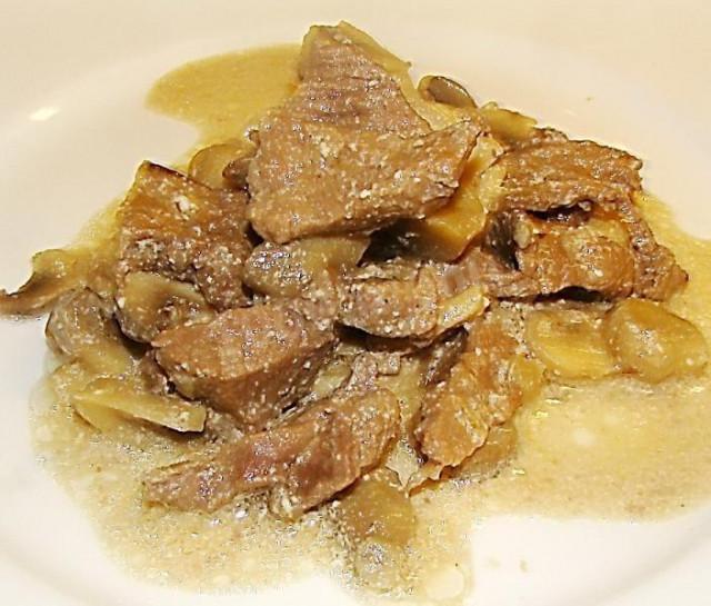 Говядина - моё любимое мясо, а любимая еда из неё - бефстроганов из говядины. Рассказываю вам кулинарный рецепт приготовления невероятного по вкусовым качествам блюда, которое можно готовить как в обычный воскресный день для своей семьи, так и в праздник гостям. Итак, для начала промываем говядину, разрезаем поперек на кусочки приблизительно 1 см. толщиной. Теперь хорошенько отбиваем мясо и нарезаем полосочками около 5 см. длиной. Затем очищаем лук и мелко его рубим. Берём грибы, промываем их и отрезаем ножки. Теперь разогреваем сковороду, вливаем масло и обжариваем в нём лук. Затем добавляем шампиньоны и увеличиваем огонь, солим массу по вкусу, перемешиваем. Когда грибочки поджарятся, уменьшаем пламя до минимума. Затем добавляем сметану, а через пару минут горчицу. Ещё через 1-2 минуты соус для мяса готов. Теперь готовим говядину. Для этого разогреваем в сковороде масло, помещаем туда мясо и обжариваем его примерно 5-7 минут. Солим и перчим мясо по вкусу. Теперь перекладываем полуготовую говядину в сковородку с готовым, накрываем её фольгой и ставим в разогретую до 180 градусов духовку примерно на 20 минут. По прошествии этого времени достаём бефстроганов из духовки, выкладываем на блюдо. Вместе с ним на гарнир можно подать картофель пюре ли рис.