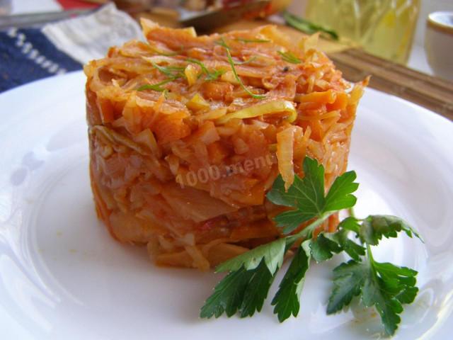 Белокочанная капуста с томатной пастой луком в мультиварке