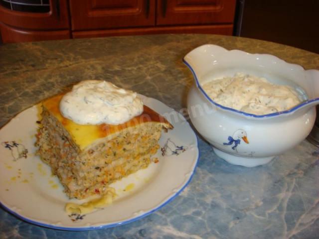 Можно сделать соус. Я смешала сметану, майонез, выдавленный через чеснокодавилку чеснок, мелко нарезанный укроп.