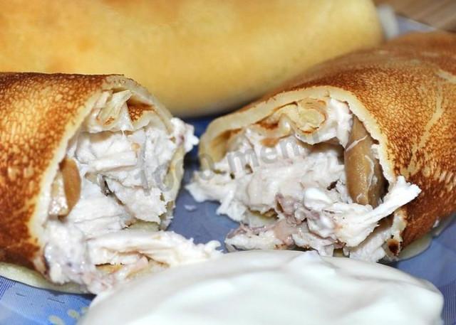 Нагреваем и обмазываем маслом сковороду, обжариваем блинчики с обеих сторон. Нарезаем лук, обжариваем его до золотистого цвета. Очищенные и помытые грибы нарезаем, добавляем их к луку, жарим до готовности, солим и перчим. Нарезаем курятину на кусочки, смешиваем с поджаркой, посыпаем тертым сыром.