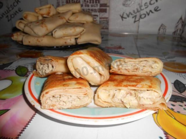Теперь приступить ко второй начинке. Но, т.к. начинок два вида, значит нужно, чтобы блинчики как-то отличались.. Поэтому блины с куриной начинкой будем заворачивать немножко иначе - сделав их более квадратными. Для этого также выкладываем начинку на прожаренную сторону, но уже подальше от края и более квадратно (также по 1 ст.л.) Сверху кладем немного сыра. Свернуть также два раза, после завернуть боковые края, но уже в нахлест, и вернуть до конца.