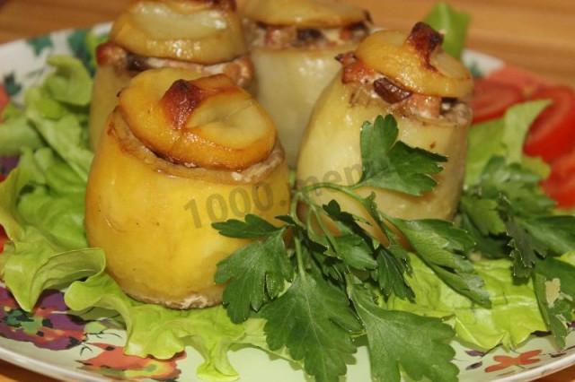 С каждого клубня картошки срезаем донышко, чтобы наши "бочонки" уверенно стояли. Затем срезаем верхушку, откладываем пока в сторонку. Из каждого клубня картошки очень аккуратно вынимаем сердцевину. Я пользовалась чайной ложкой. Не заденьте дно и не повредите стенки. Желательно вынуть сердцевину по максимуму!