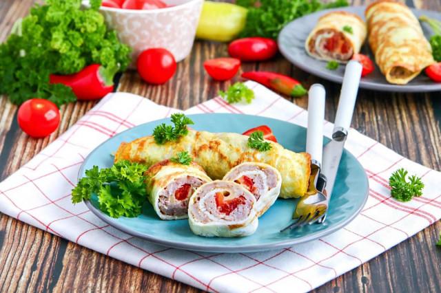 Сверните блинчик с начинкой в плотный рулет. Сформируйте таким образом остальные бризоли.
