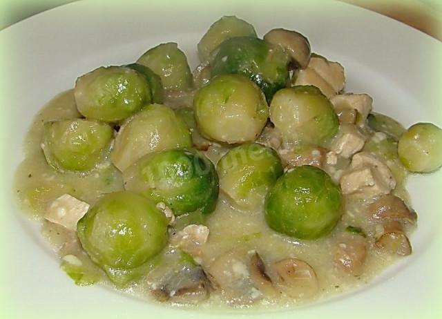 Лук очистить и порезать кубиками, куриное филе тоже порезать кубиками. Грибы помыть и нарезать пластинами. На сковороду льем растительное масло, выкладываем наши овощи, и жарим под крышкой на протяжении 10 минут. Затем трем на терку наш сырок, добавляем воду и солим по вкусу. Капусту отварить в подсоленной воде 5 минут. Шумовкой перекладываем нашу капусту к соусу, и кипятим еще пять минут, после этого выключаем. Смачного!