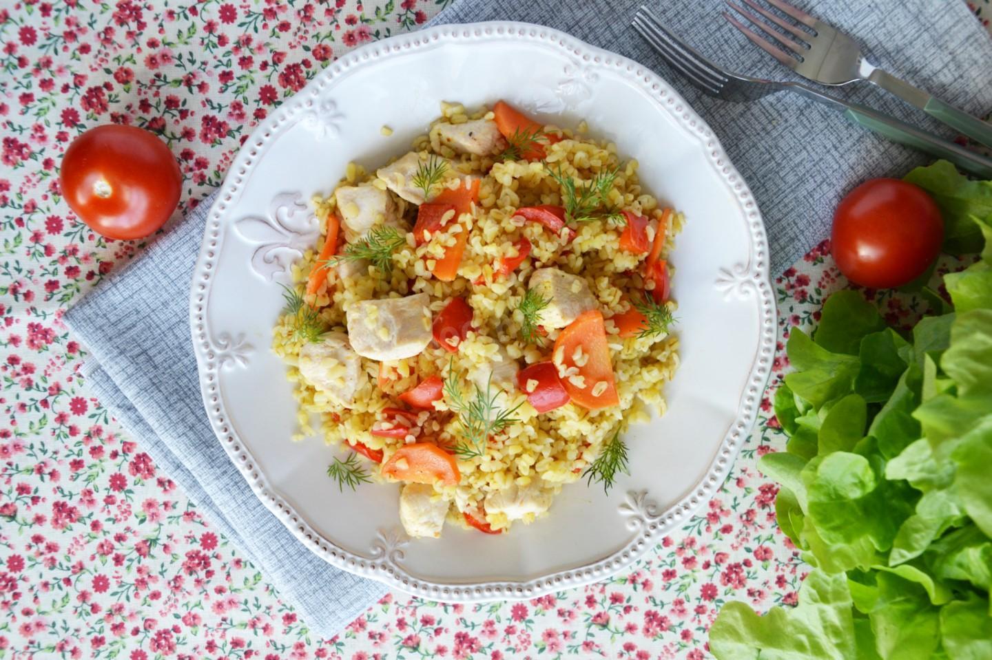 Булгур с курицей и овощами на сковороде