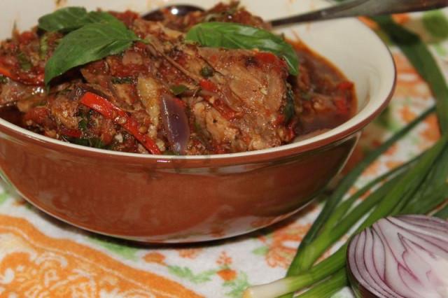 Базилик мелко нарезать, добавить к курице вместе с ухцо-сунели. Добавить лавровый лист и аджику.