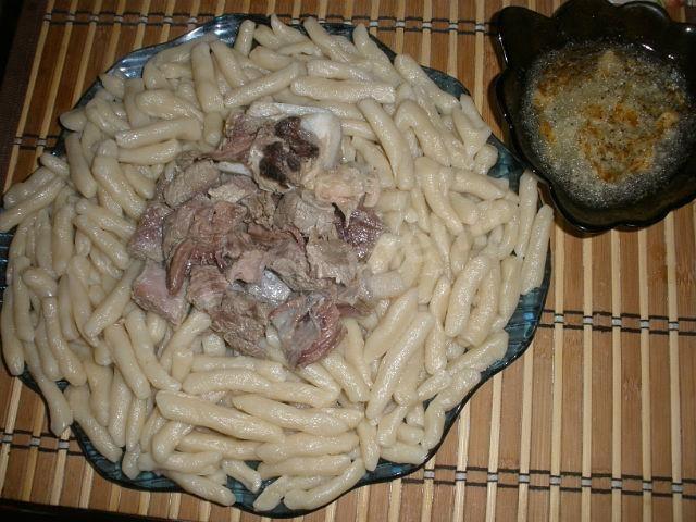 Выложить галушки на блюдо. Поверх них - мясо, нарезанное на кусочки. Чеснок подавать в пиале как соус. Мясо или галушка обмакиваются в соус и съедаются. Получаются чеченские галушки, очень вкусно.