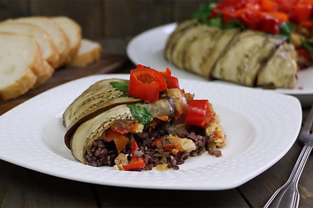 Дикий рис с курицей, баклажанами и болгарским перцем