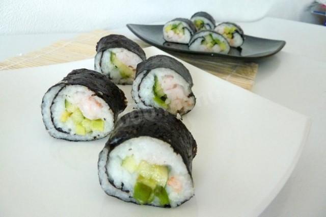 Сворачиваем и нарезаем. Роллы с креветками готовы! Их нужно есть, обмазывая васаби и макая в соус, желательно соевый.