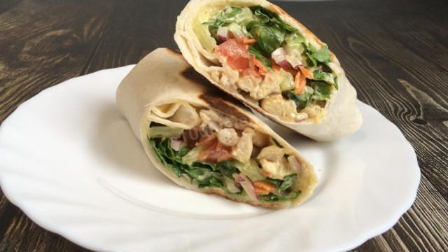 4. Тортилью смажьте соусом, выложите овощи и курицу, полете сверху соусом и заверните.