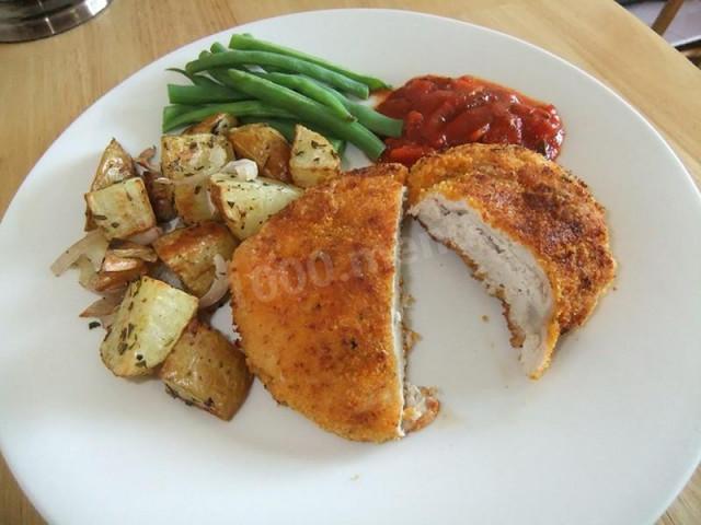 Промываем мясо, режем на кусочки. В небольшой миске взбиваем вилкой яйцо, в отдельной емкости смешиваем панировочные сухари с тертым пармезаном. Добавляем по вкусу соль и перец. Окунаем мясо в яйцо, затем обваляем в панировочных сухарях с обеих сторон и обжариваем на растительном масле по несколько минут (до золотистой корочки).