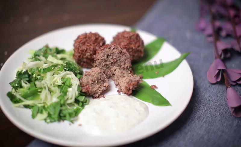 Ёжики из красного риса на пару с соусом дзадзики