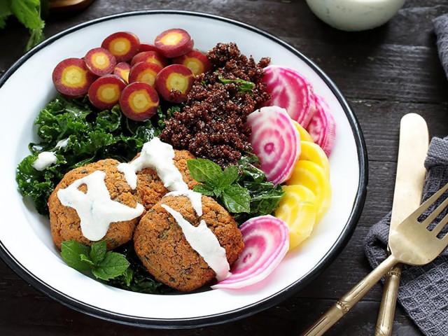 Подавать готовые фалафель из красной чечевицы горячими вместе с овощами, свежей зеленью и кунжутной пастой тахини.