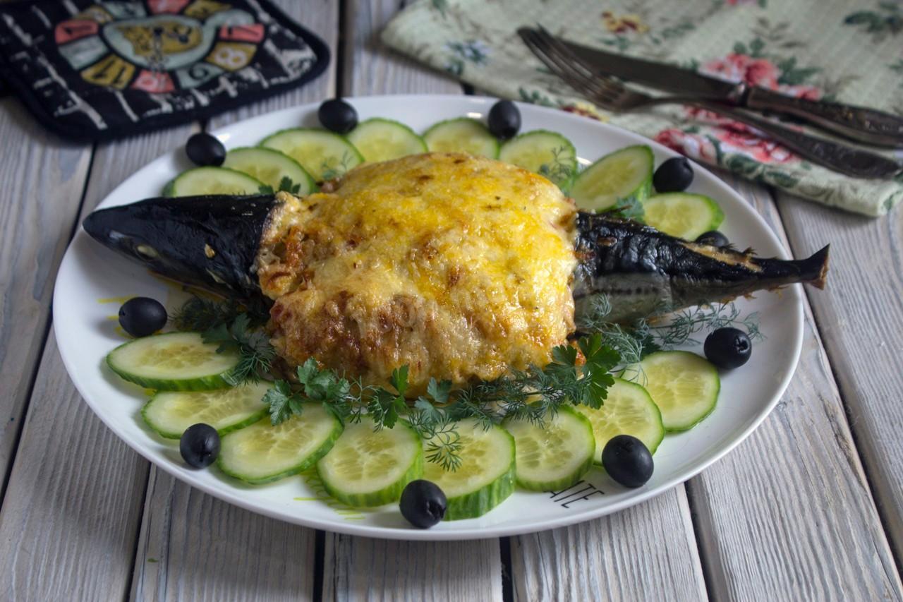 Перекладываем скумбрию в форму для запекания, выкладываем начинку из овощей, сверху трем твердый сыр, а верх смазываем небольшим количеством майонеза, чтобы сырная корочка в процессе запекания не подсохла. Запекаем фаршированную скумбрию в разогретой до 180 градусов духовке в течение 30 минут