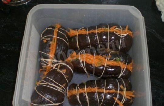 Данной овощной смесью фаршируем баклажаны и кладем их в эмалированную посуду плотненько друг к другу, попеременно добавляя душистый зелень и уксус. Накрываем все это крышкой, на которую ставим что-либо тяжелое. Баклажаны будут готовы через неделю и хранить их надо будет в прохладном месте.