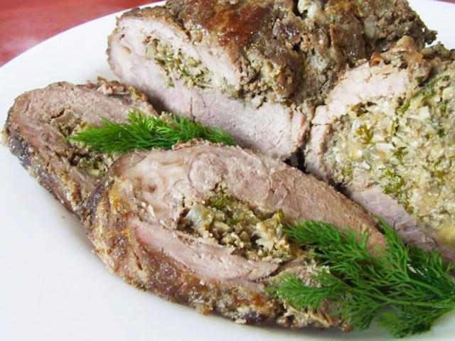 Равномерно выкладываем начинку на пласт из мяса. Сворачиваем говядину в рулет и скрепляем ее ниткой.