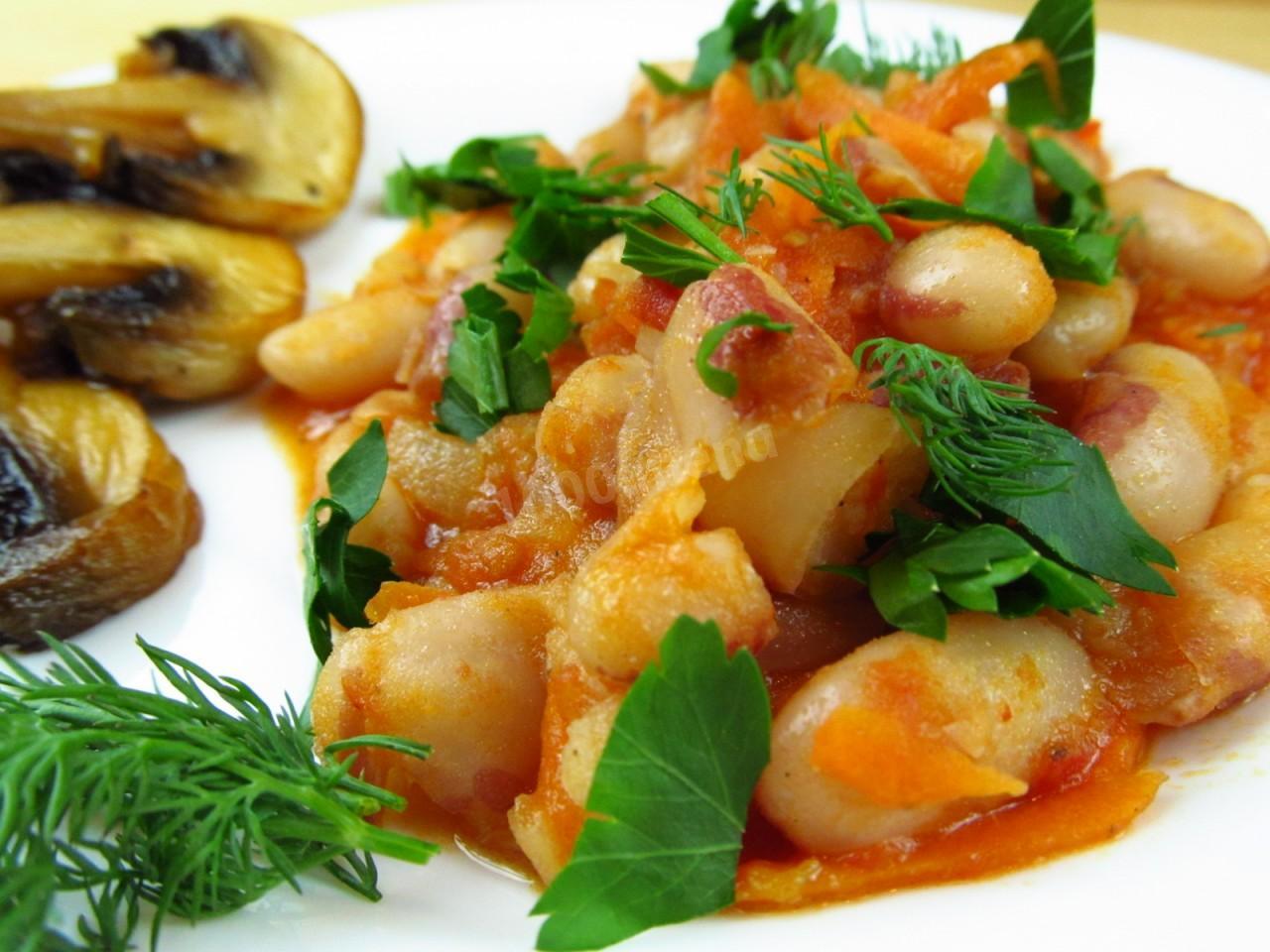 В приготовленный соус добавить отваренную фасоль, предварительно вынув из нее лавровый лист и чеснок и тушить еще 10 минут. Дать блюду немного остыть и можно подавать на стол.