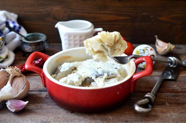 Сверху распределите сметану, - жирность на ваш вкус. Сметану вполне можно заменить и майонезом, что конечно не очень полено, а можно и сливками или легким йогуртом с нейтральным вкусом.