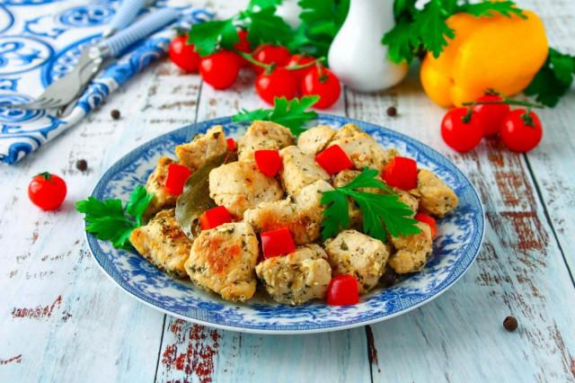 К этому времени мясо значительно размягчится и способно равномерно впитать соль и специи. Мясо посолите, добавьте базилик, душистый перец и ароматные травы, перемешайте. Тушите филе на умеренном огне 10 минут. Для получения пикантного вкуса тушеного мяса в качестве специй подойдут черный и красный молотый перец, тимьян, чеснок.