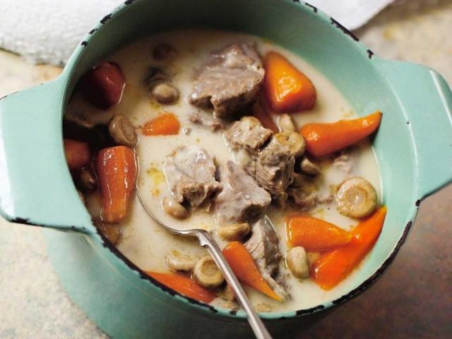 По прошествии часа проверить мясо на мягкость и снять кастрюлю с огня. Вытащить букет зелени из кастрюли.