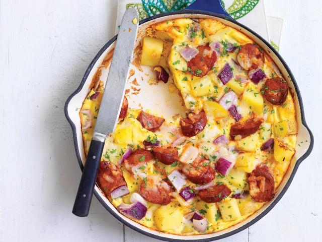 Сытный завтрак в испанском стиле. Очень вкусно и ароматно! Фриттата по испански - блюдо, которое готовить не сложно. Яркое испанское настроение этому блюду дарит Чоризо - пикантная сырокопченная колбаса красноватого цвета (благодаря большому количеству паприки в ее составе). Фриттата - удобный завтрак: вкусный, питательный, ее легко и быстро приготовить. А чтобы было еще быстрее, можно приготовить фриттату с вечера, а утром просто разогреть в духовке.
