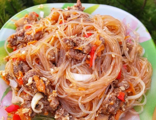Фунчоза с говядиной и овощами и соусом чим-чим