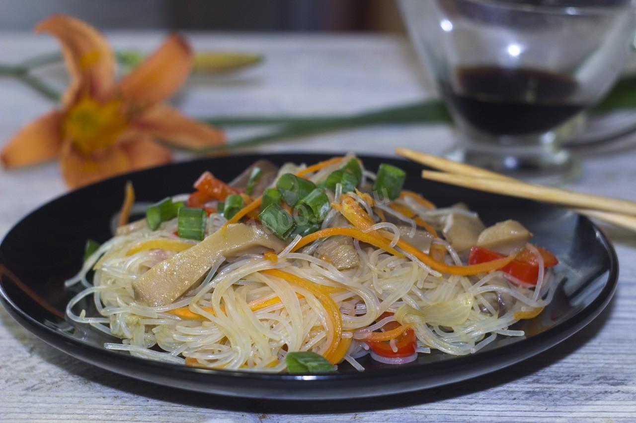 Яркое легкое, но достаточно сытное блюдо украсит ваш стол. Когда я впервые попробовала стеклянную лапшу, то влюбилась в нее навсегда! Этот рецепт мне очень нравится тем, что готовится оно мгновенно, а блюдо можно подавать в качестве горячего. Несмотря на то, что в нем нет мяса, оно достаточно сытное! Попробуйте