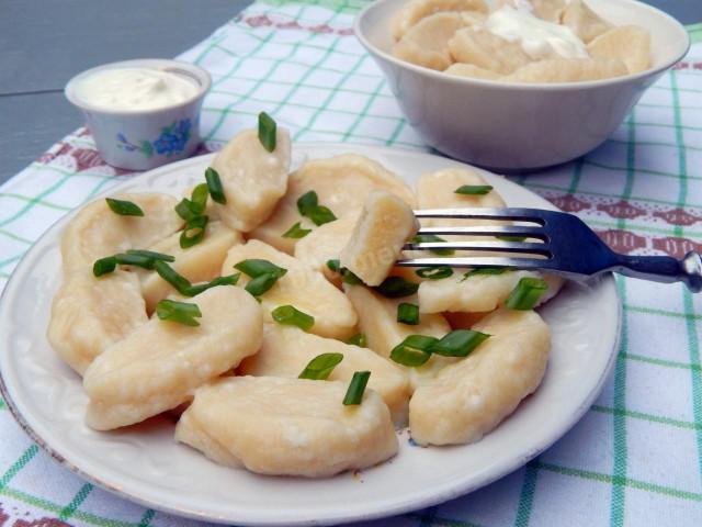В кастрюльке доводим до кипения подсоленную воду. Частями кидаем в воду галушки, деревянной ложкой помешивая, чтобы они не прилипли к дну кастрюли. Варим галушки, пока они не всплывут. После того, как галушки всплыли, варим их около 5 минут. Вылавливаем их из воды шумовкой, чтобы лишняя жидкость стекла. Выкладываем галушки на тарелку, кладем кусочек сливочного масла сверху или поливаем растопленным, лучше натуральным маслом, оно более ароматное, солим немного и присыпаем мелко порезанным зеленым луком. Либо подаем галушки со сметаной, вареньем или сгущенкой по желанию.