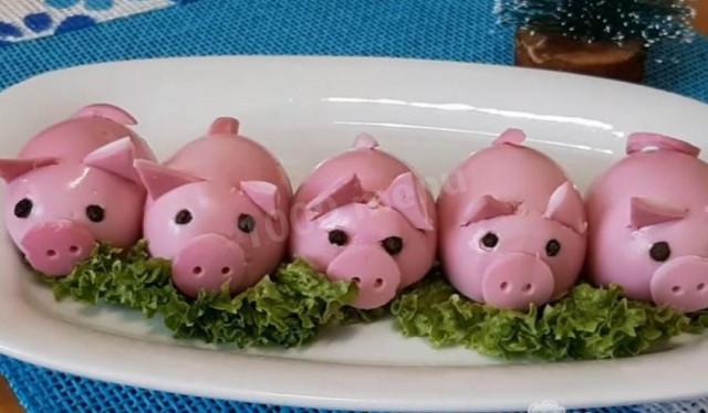 Затем в проколы вставить горошки перца – глаза. Пятачок намазать майонезом и приклеить спереди.