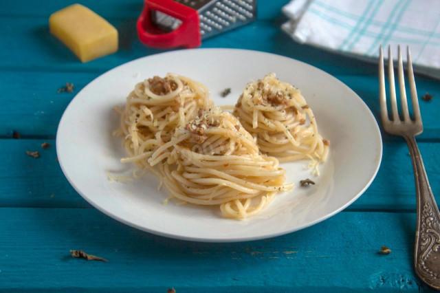 Можно красиво подать спагетти, сформировав при помощи вилки такие гнездышки, сверху можно слегка присыпать сушеным орегано или базиликом