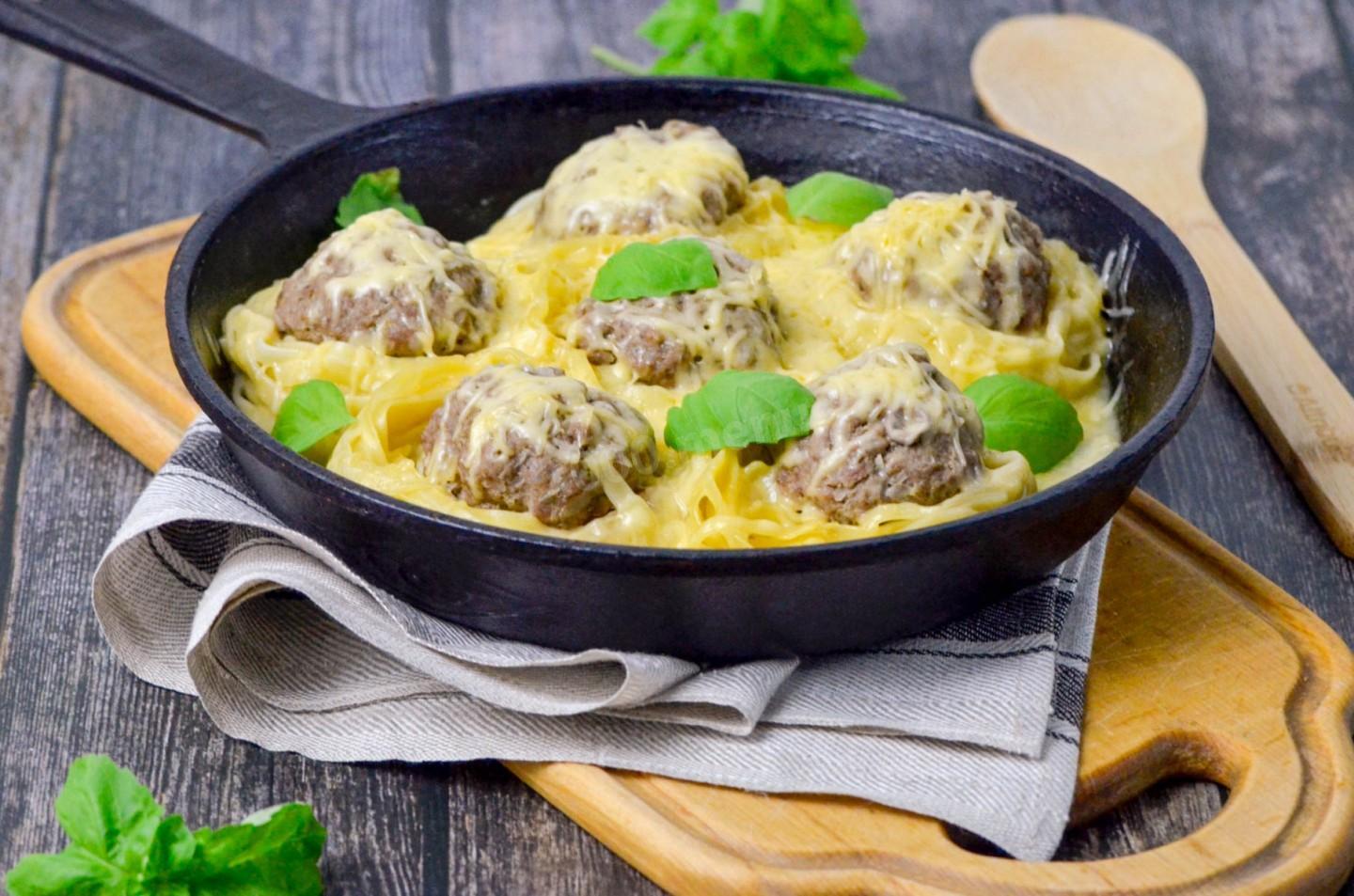 Гнезда из макарон с фаршем и сыром на сковороде