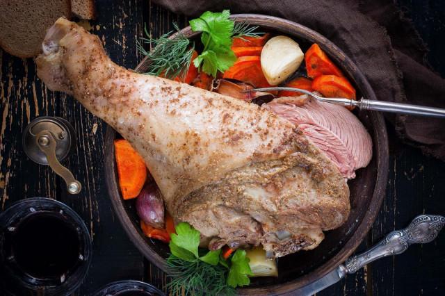 Готовую голень достать из духовки, осторожно развернуть и выложить на большое блюдо. Острым ножом обрезАть тонкие кусочки с краёв голени и подавать к столу. В качестве гарнира для этого мяса подойдут макаронные изделия, отварные рис и гречка, овощи. Запечённое мясо индейки хорошо и в остывшем виде, его можно использовать как нарезку для бутербродов, а также для приготовления других блюд (салатов, холодных закусок).