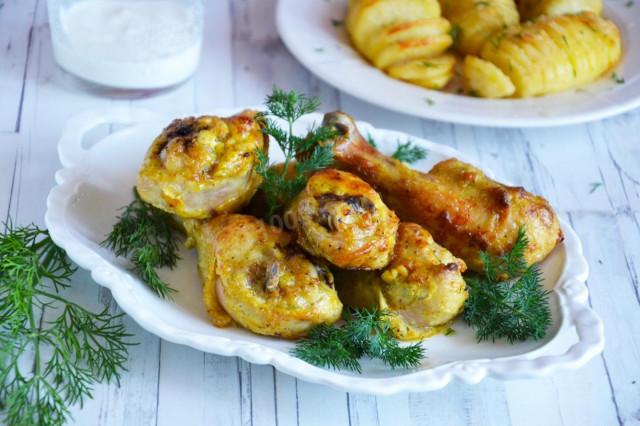 Противень застелите пергаментом. Пергамент смажьте растительным маслом. Выложите куриные ножки на противень. Запекайте курицу около 35-40 минут в разогретой до 180°С духовке, периодически поливая ножки соком со дна противня. Точное время и температуру запекания определяйте по своей духовке. Приятного аппетита!