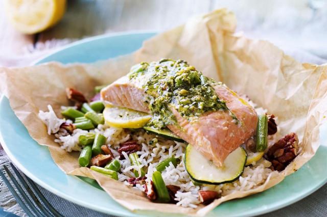5. Для подачи выложите рис с рыбой на тарелку и полейте соусом. Можно присыпать зеленью или украсить листочком петрушки.