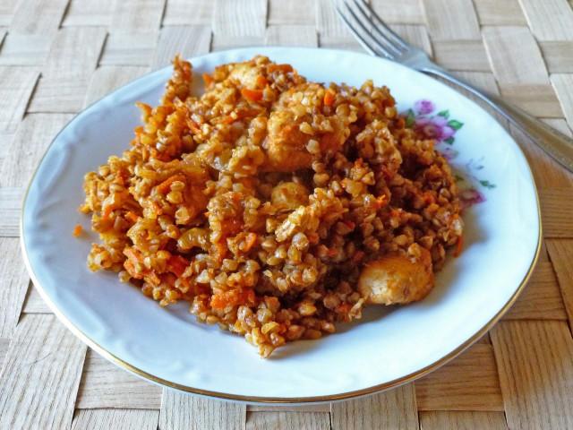 Гречневая каша получается особенно вкусной, если приготовить ее с жареным мясом, с добавлением томата. С куриным филе это блюдо готовится быстрее.