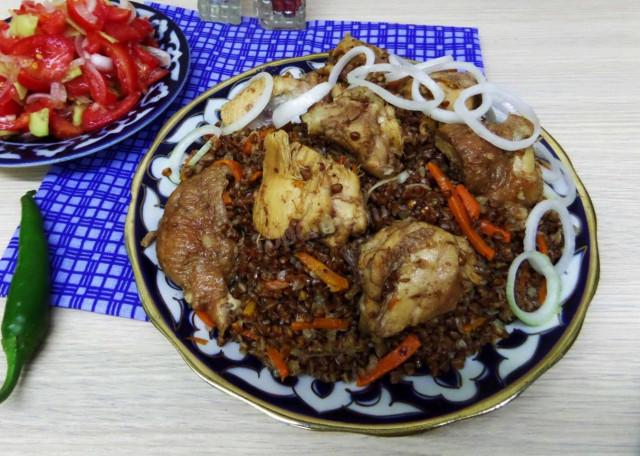 Когда мясо будет готово, хорошо промойте под проточной водой гречневую крупу. Можно воспользоваться ситом. Затем сбросьте крупу в казан, Если требуется, долейте еще кипятка. Вода должна быть выше всей массы примерно на 1 см. Попробуйте еще раз на соль. Готовьте до полной готовки гречки и выпаривания воды. Если чувствуете, что крупа уже почти готова, а вода в излишке, добавьте огонь, чтобы быстрее выпарилась лишняя влага.