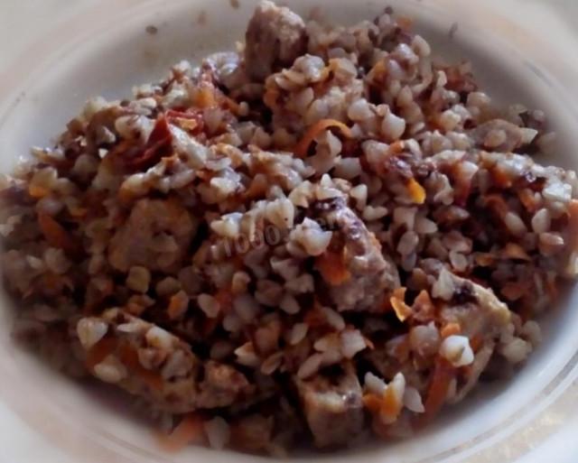 Добавляем гречку к мясу с овощами, доливаем воды так, чтобы она покрывала гречку на палец.Солим, можно по желанию добавить специи по вкусу.
