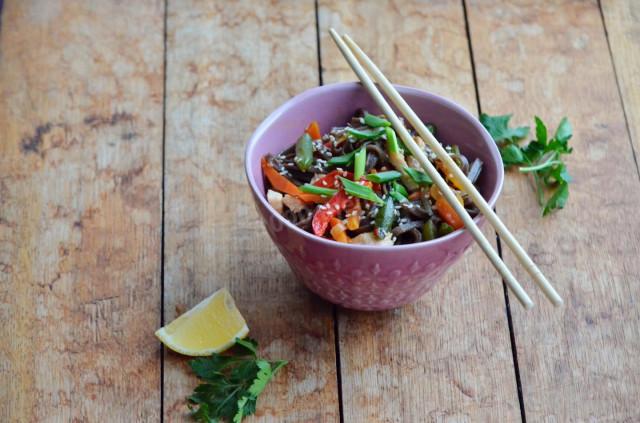 Знаменитое азиатское кушанье на твоем столе! Гречневая лапша с курицей и овощами - это блюдо, которое пришло к нам из Японии. Называется эта лапша соба и готовится она из гречневой муки. Блюда из собы придутся по вкусу любителям здоровой пищи, она сытна и питательна. Добавлять в нее можно что угодно: любые овощи, грибы, мясо, морепродукты, это как веселый кулинарный конструктор. С заправкой тоже можно поиграть: любители острого оценят, если добавить имбирь и острый перец, вкусно зазвучит лайм и кунжутное масло - вариантов множество!