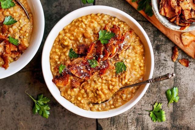 10. Раскладываем гречотто по порционным тарелкам, сверху кладем бекон, посыпаем листочками петрушки и тертым пармезаном.