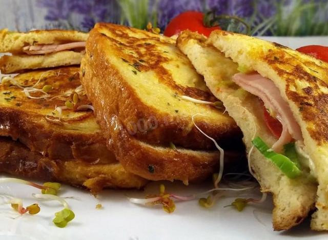 8. Плотно зажав, чтобы не вывалилась начинка, сформированный бутерброд обмакнуть в молочно-яичную смесь с двух сторон. А затем выложить на сковороду с растопленным сливочным маслом. Обжарить гренки с одной стороны на среднем огне. А затем аккуратно перевернуть на другую сторону и также обжарить до золотистого цвета.