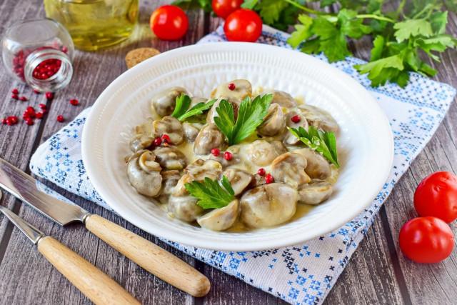 Спустя указанное время мультиварка издаст звуковой сигнал, оповещающий о том, что блюдо готово. Откройте крышку, выложите грибочки в сливочном соусе на тарелку и подавайте к столу. Приятного аппетита!