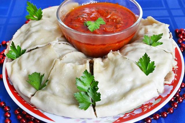 Готовый ханум переложите на плоское большое блюдо, разрежьте на порционные кусочки. И, украсив свежей петрушкой, подавайте на стол, дополнив домашним томатным соусом.