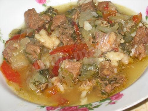 Кастрюлю налейте столько воды, чтобы она прикрывала все ингредиенты. После этого тушите хашламу на среднем огне 2-3 часа. Обязательно следите за уровнем воды в кастрюле и по мере того как она будет выпариваться доливайте её до нужного уровня.