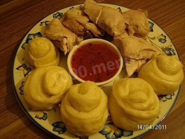 Подавать хинкал с мясом вареным или курятиной. И с чесночно-томатным соусом.