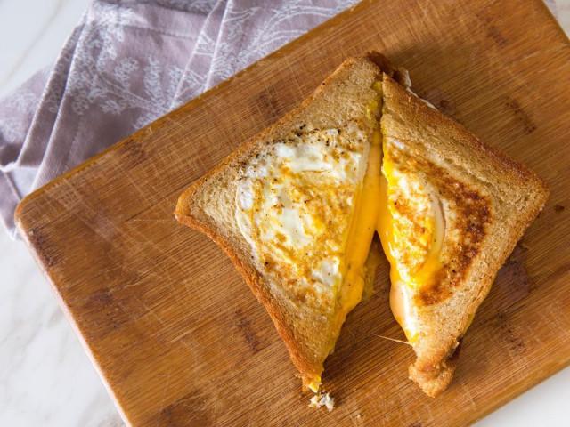 Поджариваем бутерброд еще около минуты с каждой стороны до тех пор, пока сыр не скрепит две половинки между собой, а на поверхности не появится аппетитная корочка. В идеально приготовленном хлебе с сыром и яйцом ломтики хлеба будут соединены расплавившимся и слегка вытекшим сыром, а яичный желток при раскусывании останется мягким.