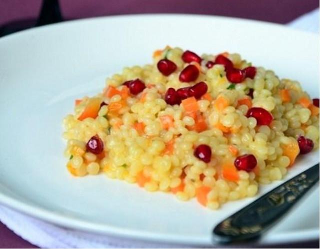 Птитим отвариваем в большом количестве подсоленной воды минут 6 (внутри он еще будет немного хрустеть). Готовый птитим откидываем на сито.